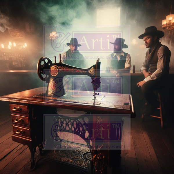 Arti-Designs, Sewing Machine, Gates Museum, AI Generated, Hand Re-touched, Copyright (2024) Gates Museum Ltd, Gates Art, Gates Gallery, Gates Community, Arti-Designs Did you know ...?Foot pedal -The part of a sewing machine that controls the speed at which the needle enters the fabric. It is controlled by the foot of the machinist and usually attaches to the machine via a lead.